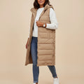 Denna långa väst för dam är en ärmlös modell med huva och genomgående stängning framtill. Västen är avsedd att bäras över långärmade plagg under höst och vinter vid vardag, promenader och andra utomhusaktiviteter.